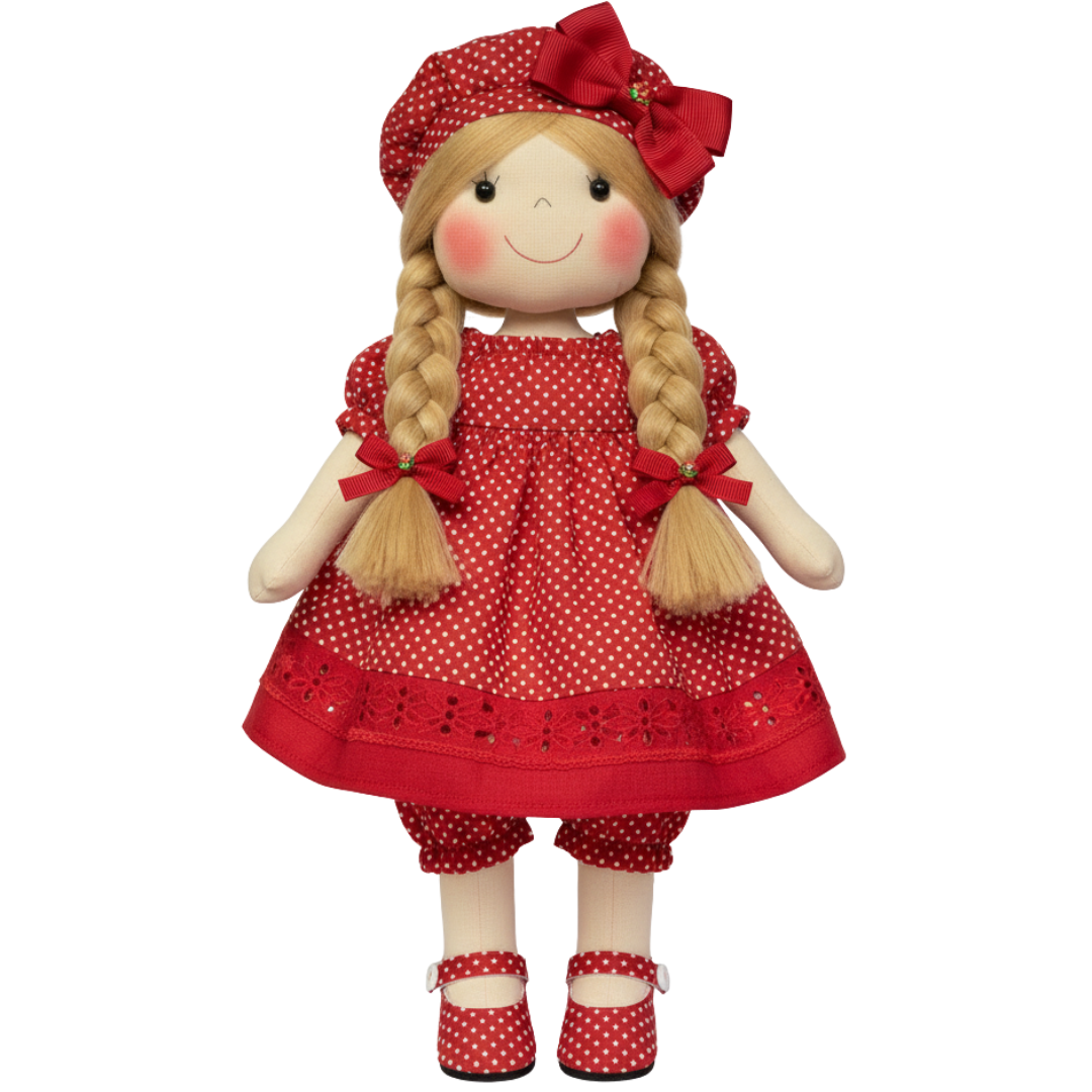 Materiais: Corpo em algodão cru de alta gramatura, vestido em tricoline 100% algodão, enchimento com fibra siliconada antialérgica, cabelos de lã e olhos de botão com costura reforçada.