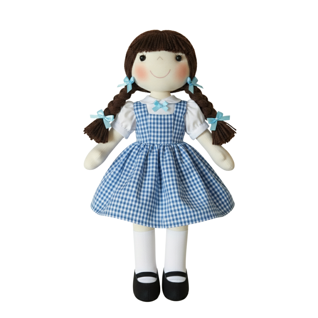 Siga a estrada de tijolos amarelos com a nossa boneca da Dorothy, a Viajante de Oz! Parte da coleção Reino Mágico, esta é uma boneca de pano articulada de 40 cm, pronta para encontrar o grande mágico com seus sapatinhos de rubi.